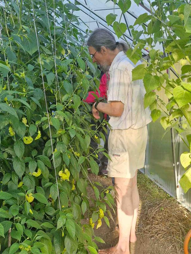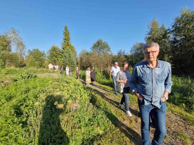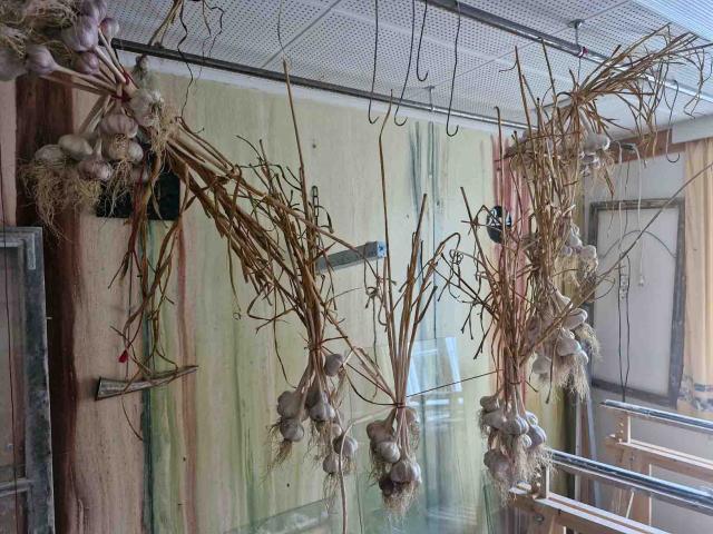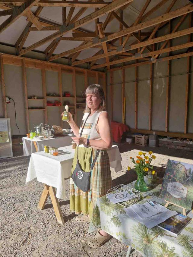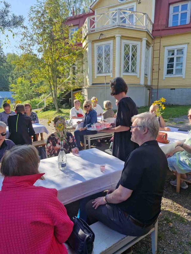 Elokuun loppu oli vielä kesäinen ja lämmin kun parisenkymmentä valkosipulin ystävää vieraili perunoista tunnetulla Lopella, tällä kertaa Pilpalan kylässä Solstrandin valkosipulitilalla. Pilpalan Sinervänniemellä Näkyvä-nimisen lammen rannalla on asuttu jo pitkään. Tilan vanhin rakennus on torppa, jossa 1800-luvun puolivälin jälkeen asusteli noitanakin tunnettu Serafia. Tarina kertoo, että eräskin hammassärkyyn Serafialta apua hakenut ei koskaan avun saatuaan enää potenut hammaskipua. Näin loppukesästä sato oli pääosin jo korjattu mutta saimme mielenkiintoisen katsauksen tilan historiaan sekä sen nykyisten omistajien Lassin ja Marikan elämään. Viljelijän kesä on täynnä työtä, vapaa-aikaa löytyy sitten talvella paremmin. Kiersimme puutarhan, ihmettelimme monelle uusia tuttavuuksia, mansikkakoisoa sekä pesusienikurkkua. Tilalla viljellään toki paljon muutakin, chiliä, kurkkua, tomaattia jne jne . Valkosipuliakin tietysti löytyi vielä kuivamassa. Tunnelma on rento ja leppoisa. Keitot ja piirakat maistuivat osallistujille ja saimme maistella tilan tuotteita – useampi osti niitä kotiinkin viemisiksi. Omasta tuliaiskassista löytyy muun muassa pikkelöidyt pihlajanmarjat, ruusuraparperi- sekä kuusenkerkkähillo sekä valkosipulilla ja chilillä maustettu kurkkusalaatti. Sää suosi, ilma oli lämmin ja aurinkoinen. Kotiin lähdettiin kaikin puolin kylläisinä ja tyytyväisinä. Lisää tällaisia, kuuluivat kommentit bussissa.